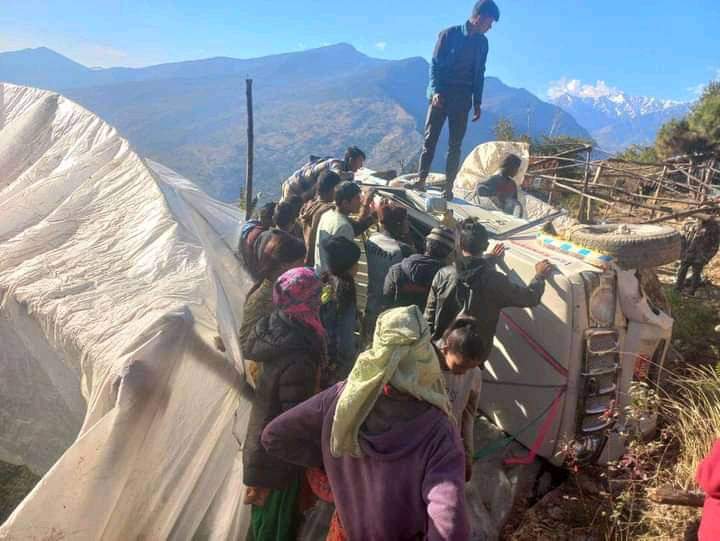 यात्रुहरुलाइ घर छोडेर फर्किने क्रममा घुम्ती मोडमा जीप दुर्घटना हुदाँ जीप सडकबाट ५० मिटर तल खसेको थियो जीप चालक प्रतिवन सार्कि सकुशल रहेका छन