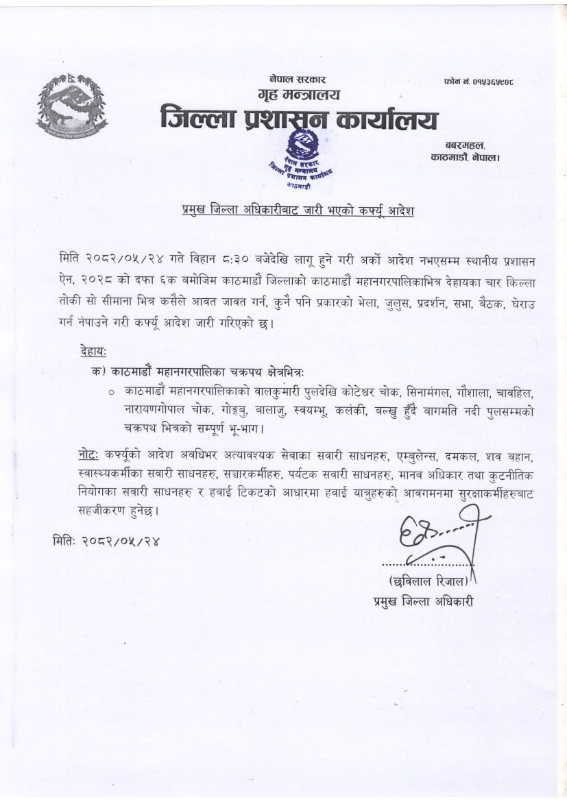 काठमाडौं । काठमाडौं जिल्ला प्रशासन कार्यालयले आजदेखि चक्रपथ क्षेत्रभित्र कर्फ्यु आदेश जारी गरेको छ। प्रमुख जिल्ला अधिकारी छविलाल रिजालका अनुसार कर्फ्यु आज बिहान साढे ८ बजेदेखि अनिश्चितकालका लागि लागू गरिएको हो।