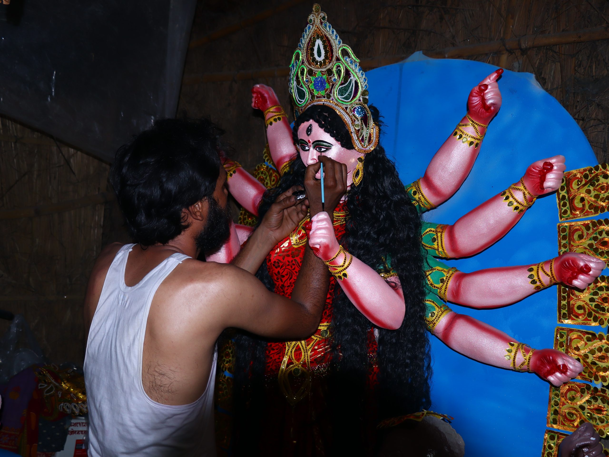 मूर्ति निर्माणमा पहिलो चरणमा बाँस र काठको अस्थि संरचना तयार गरिन्छ। त्यसपछि कपडा बेरेर माटोको तह लगाइन्छ। माटो सुकेसँगै तह थपिँदै जान्छ। अन्तिममा रङ्ग र सजावट गरेर मूर्ति पूरै तयार पारिन्छ।