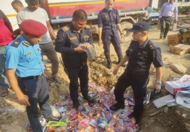 विभिन्न मितिमा भारतबाट नेपाल तर्फ ल्याउदै गरेको राईट रोल क्याप्स, उज्यालो हाईड्रोफल, ग्राउण्ड चक्कर, फ्लोर पोटस सानो, फ्लोर पोटस ठुलो, झील झेले, लम्बा बुलेट, खुर्सानी लगायतका बिभिन्न किसिमका पटका तथा झिलझिले  जिल्ला प्रहरी कार्यालय तथा मातहत प्रहरी ईकाईबाट खटिएको प्रहरी टोलीले जिल्लाका बिभिन्न स्थानबाट वरामद गरी आज मिति २०७८ कार्तिक २२ गते स्थानिय जनप्रतिनिधी, संचारकर्मी तथा स्थानिय व्यक्तीहरुको रोहबरमा जिल्ला प्रहरी कार्यालय परिसरमा खाल्डो खनि पुरी नष्ट गरिएको छ ।