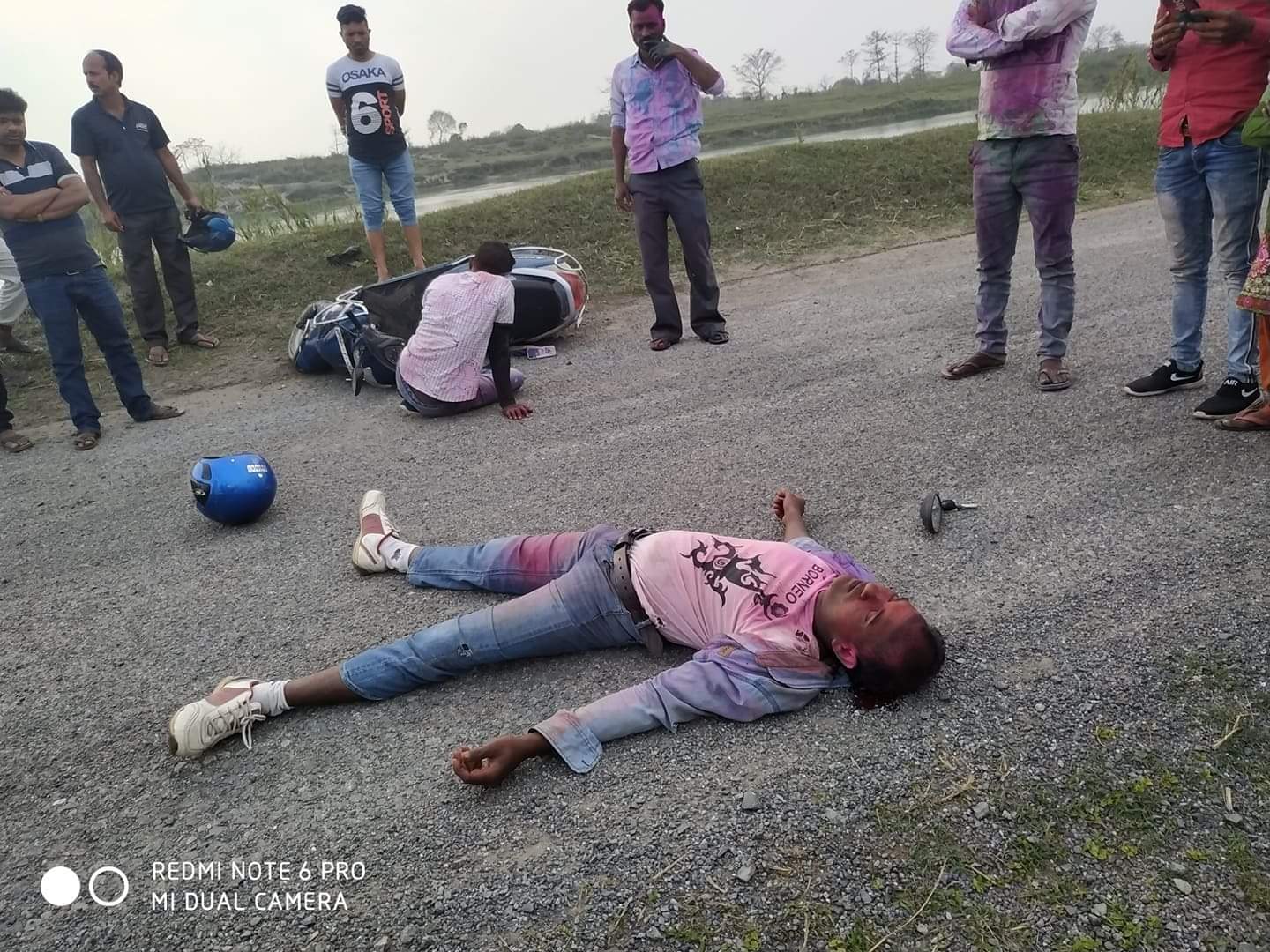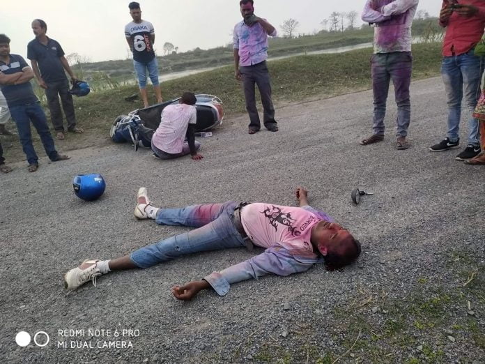 भारतीय प्लेट नम्बर युपी ५६ वाई ३८३६ माेटरसाइकल अनियन्त्रित हुदा सो दुर्घटना भएकाे थियाे ।