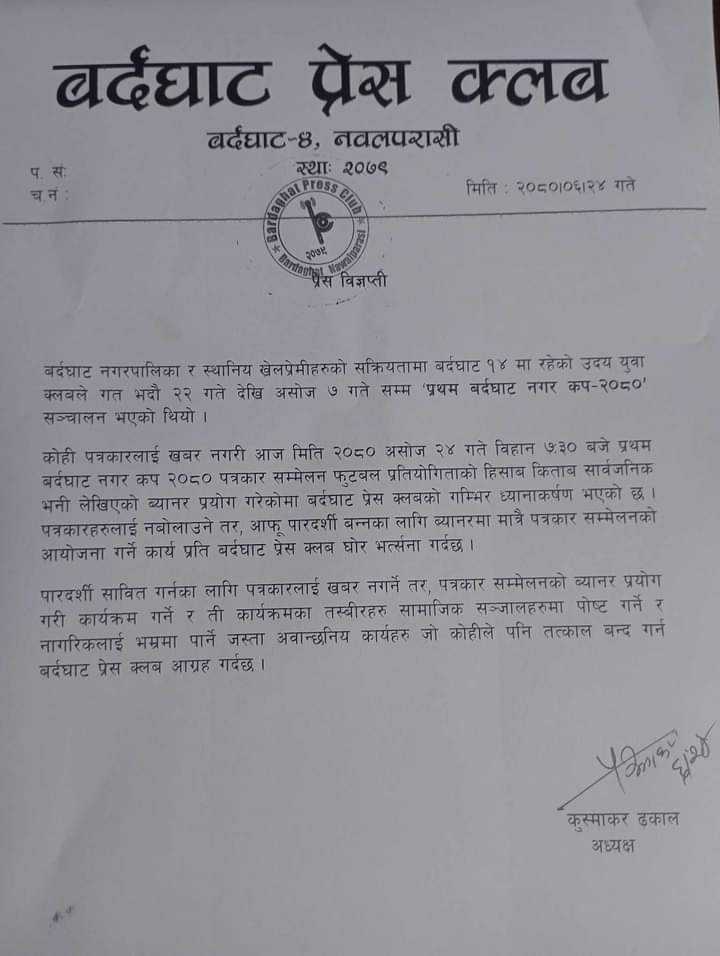 बुधबार विहान साढे ७ बजे कोही पत्रकारलाई खबर नगरी प्रथम बर्दघाट नगर कप २०८० पत्रकार सम्मेलन फुटबल प्रतियोगिताको हिसाब किताब सार्वजनीक  लेखिएको ब्यानर प्रयोग गरेको थियो । पत्रकारहरुलाई नबोलाउने तर, आफू पारदर्शी बन्नका लागि ब्यानरमा मात्रै पत्रकार सम्मेलनको आयोजना गर्ने कार्य गरिएको भन्दै  क्लबले बिज्ञप्ति जारि गरी घोर भर्त्सना गरेको जनाएको छ ।