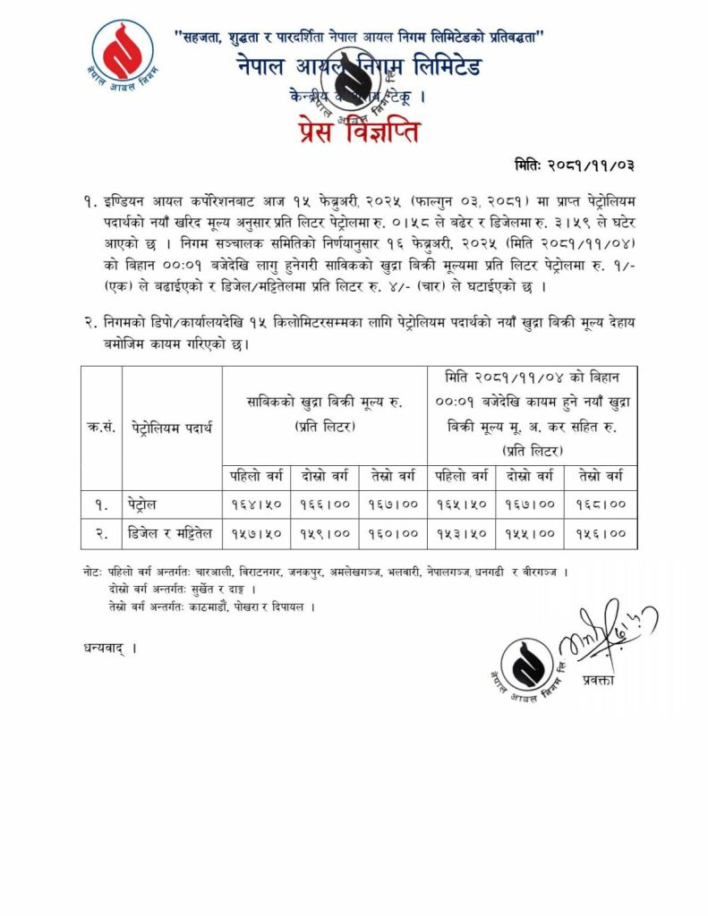 निगमका अनुसार पेट्रोलको मूल्य प्रतिलिटर १ रुपैयाँ बढ्दा डिजेल तथा मट्टितेलको मूल्य ४ रुपैयाँ घटेको छ । नयाँ मूल्य आज मध्यराति देखि लागू हुने छ ।