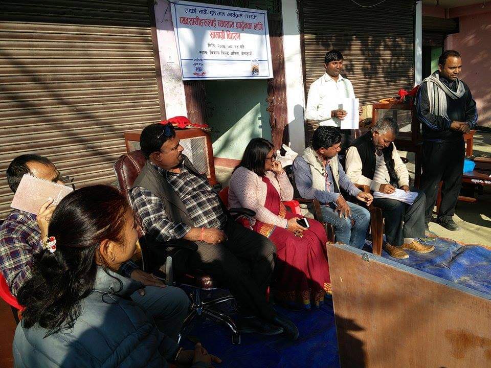 ब्यवसायिहरुलाई ब्यवसाय प्रवर्द्वनका लागि अतिबिपन्न १० जनालाई किराना सामग्री तराजु,ढक , १ बाेरा नुन ,च्याउच्याउ,खाने सामग्री,कुर्सी,ब्रेन्च र अन्य सामग्री त्यस्तै ब्यउटिसियन गर्नेलाई १थान हुइलकुर्सी ,अाइना कपडा ,काइयाे कर्सि,ब्रेन्च,पाउडरहरु,साेकेस ,अन्य अाैजारहरु त्यस्तै नाइलाई हुइलकुर्सी,ब्रेन्च ,अाइना कपडा ,काइयाे,कैँची ,पाउडरहरु,र अन्य सामग्रीहरु त्यस्तै चिया पसल गर्नेलाई कुर्सी ,टेबल,ब्रेन्च,साेकेस,अावश्यक पर्ने भाडा र अन्य सामग्री त्यस्तै मासु काट्नेलाई,दाउ,ग्यास,चुलाे, ब्रेन्च ,टेबल,कुर्सी, कपडा ,तराजु ,ढक र अन्य सामग्री हस्तान्तरण गरिएको छ।