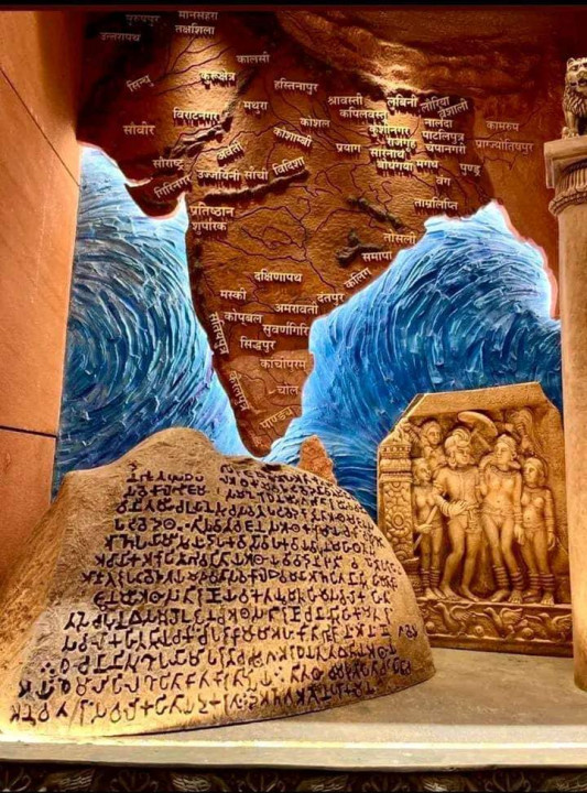 भित्ते चित्रको वर्णन पाठ ब्राह्मीमा लेखिएको छ, जुन अशोक कालमा प्रयोग भएको पुरानो लिपि हो, यसले पनि यस नक्साको ऐतिहासिक र सांस्कृतिक पक्षहरूमा केन्द्रित रहेको संकेत गर्दछ। भारतका केही अबुझ नेताहरुले यसलाई अखण्ड भारत वर्षको प्रतिनिधित्वको रूपमा भ्रामक दावीहरू गर्दै समाजिक सञ्जालमा पोष्ट गर्न थालेपछि नक्साबारे विवाद उत्पन्न भएको हो ।