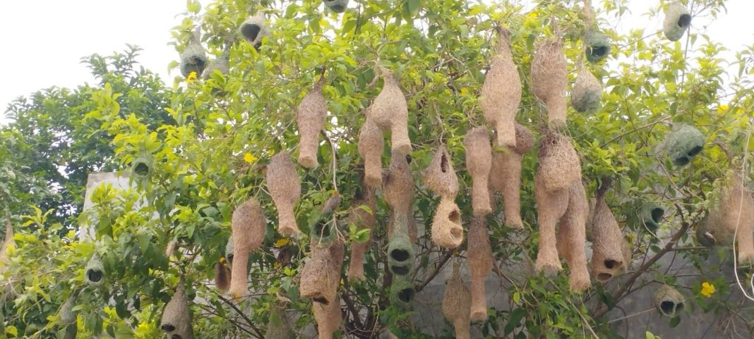 लुम्बिनीमा Streaked Weaver चरा द्वारा निर्मित सयौँ गुँडले पर्यटक मोहित