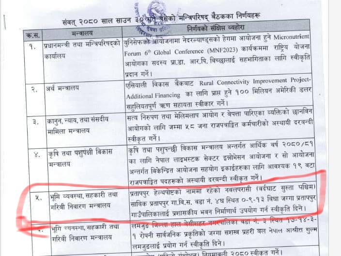 नवलपरासी (ब.सु.प.) को प्रतापपुर हेल्थपोस्टको नाममा रहेको जग्गा प्रतापपुर गाउँपालिकालाई प्रशासकीय भवन निर्माणका लागि उपयोग गर्न स्वीकृति दिने मन्त्रिपरिषद्को निर्णय भएको हो । यस निर्णयले स्थानीयवासी खुसी भएका छन् ।