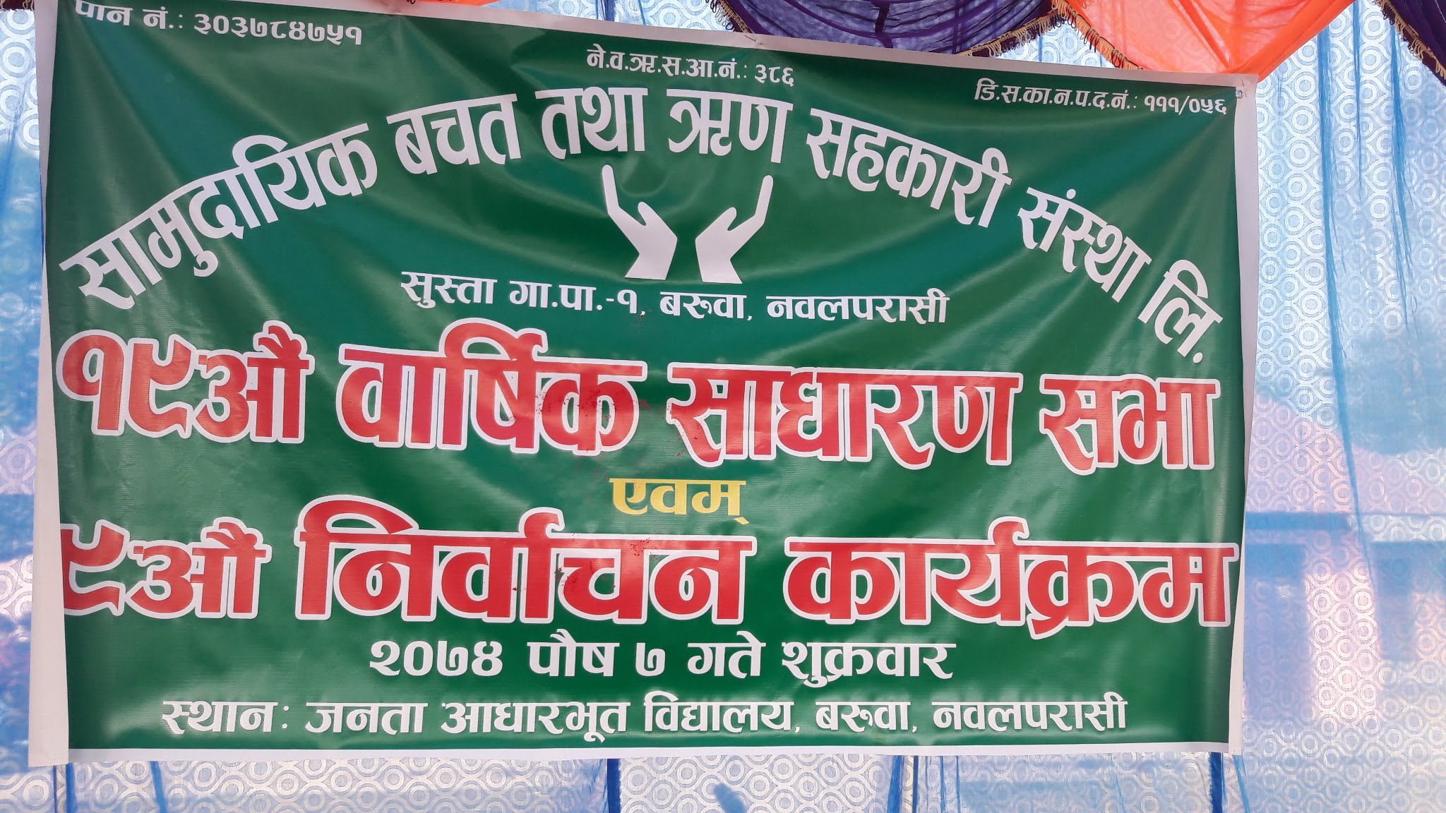 संस्थाका कार्यवाहक अध्यक्ष शान्ता आर्यालको अध्यक्षता तथा सुस्ता गाउँपालिका वार्ड न १ का वडा अध्यक्ष अशोक कुमार चौधरीको प्रमुख अतिथ्यतामा कार्यक्रम सम्पन्न भएको हाे । कार्यक्रममा संस्थाका कोषाध्यक्ष रामनारायण चौधरीले आ ब ०७३/०७४ काे सामुदायिक बचत तथा ऋण सहकारी संस्था लिमिटेड बरुवाले १ करोड ३३ लाख ९५ हजार ५ सय ६४ रुपैया बराबरको कारोबार गरेको आर्थिक प्रतिबेदनमा प्रस्तुत गर्नु भएको थियो ।